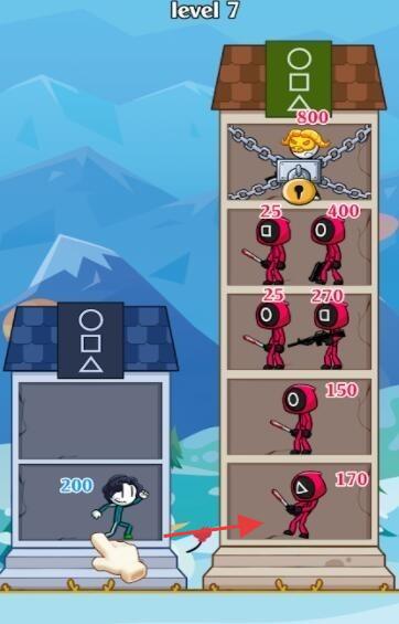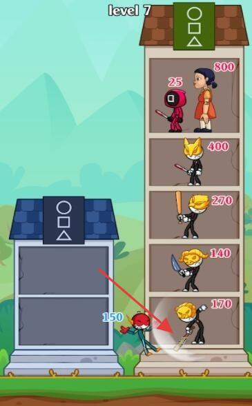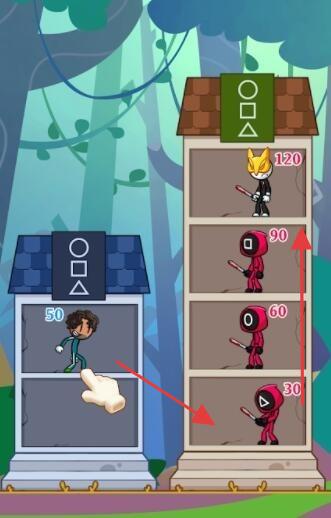 1、在楼层地图,点击己方角色(左侧房屋),拖动到右侧敌方楼层,与对应数值敌人战斗。