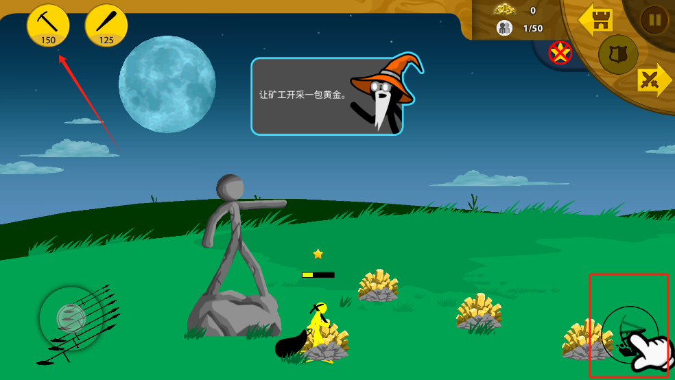 3、训练矿工,并让他们开采一包黄金,黄金可以用来训练更多的矿工和棍棒手