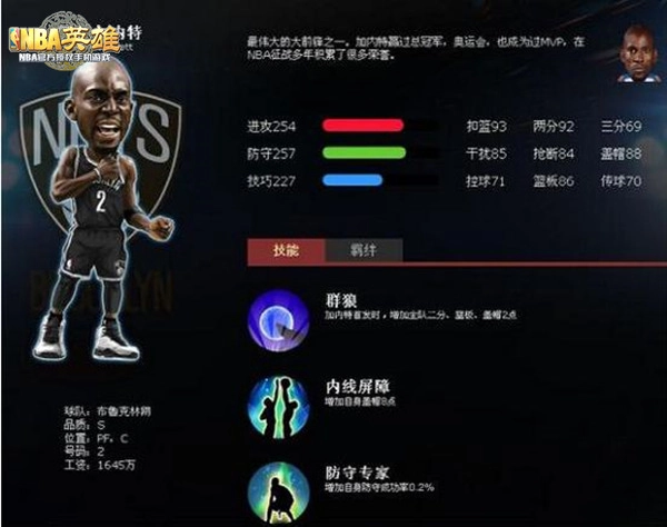 加内特堪称球场上的“狼王”,他的进攻如同饿狼扑食般犀利,爆发力惊人,而令人赞叹的是,其防守能力同样出类拔萃,在NBA现役大前锋中名列前茅。在游戏世界里,“狼王”加内特依旧强势,“群狼”技能自带光环,能为首发全体带来加成BUFF,无疑是热门球员。要是小伙伴们在游戏中急需大前锋,选择“狼王”加内特绝对不会错,他值得拥有!