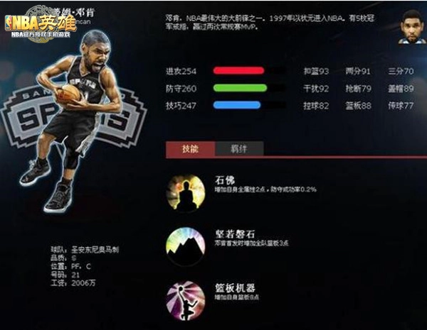 毫无疑问,邓肯堪称NBA历史上最为卓越的大前锋之一。这位平日里沉默寡言,总是一副 “扑克脸” 的男人,给予队友的是一种难以言表的信赖感与安全感。在游戏世界里,邓肯同样是一位兼具出色进攻与防守能力的热门球员!想要获取他的碎片,可通过排位赛的荣誉商店达成,各位热爱马刺队的小伙伴们,一定要多多争取在排位赛中取得好名次呀!
