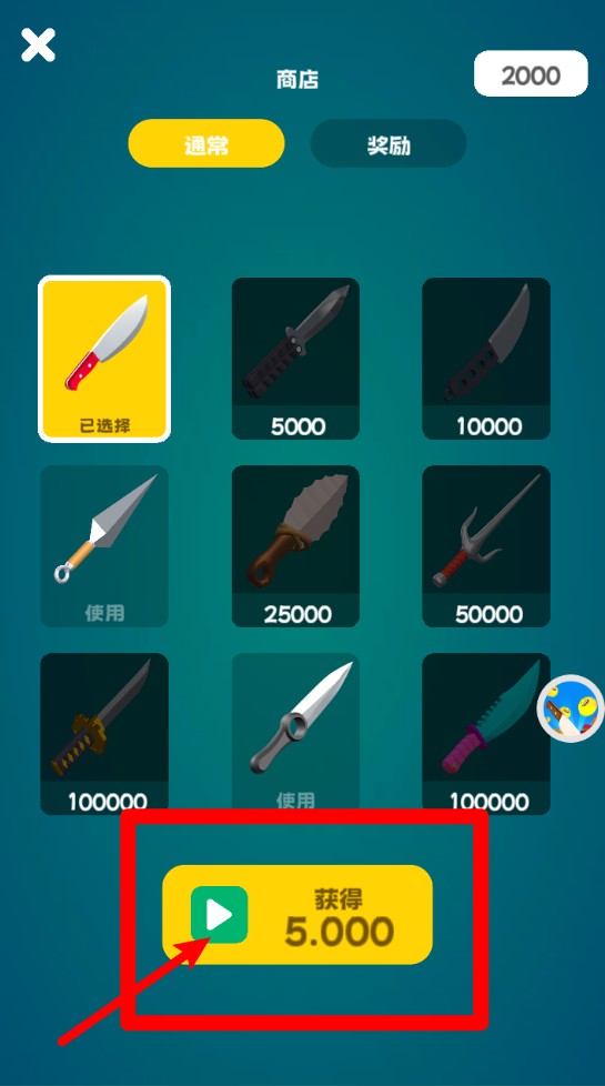 2.刀具解锁方式:点击广告图标获取5000金币奖励,可用来解锁更多造型炫酷的新刀具。