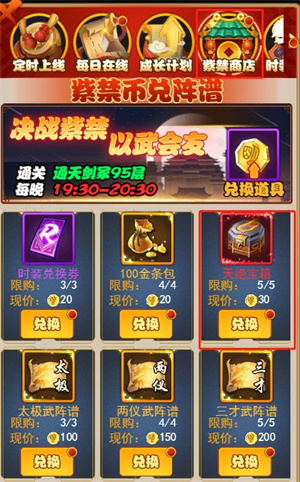 每天匹配战力低的对手,如果匹配到高的可以取消(匹配后显示系统会显示取消按钮),保证自己每天最少可以拿到28个币(未算排名奖励),排名是根据大区的战力排序的,一搬前三都是氪金玩家,紫禁商店紫禁币优先兑换阵法,阵法满阶后开始兑换天绝宝箱(每周可以兑换5个),每周会更新,客服说是根据开区时间更新。