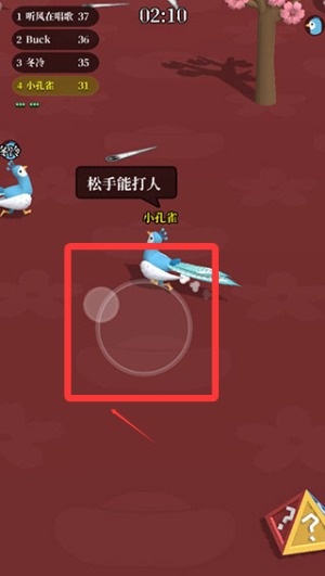 2、开始游戏后利用虚拟摇杆来控制小孔雀移动并收集羽毛,只要松开就可以攻击其他孔雀。