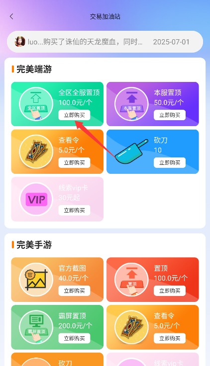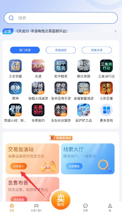2、在进入首页点击交易加油站服务专区,系统将自动跳转至道具交易市场界面。