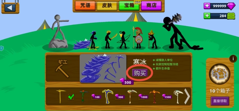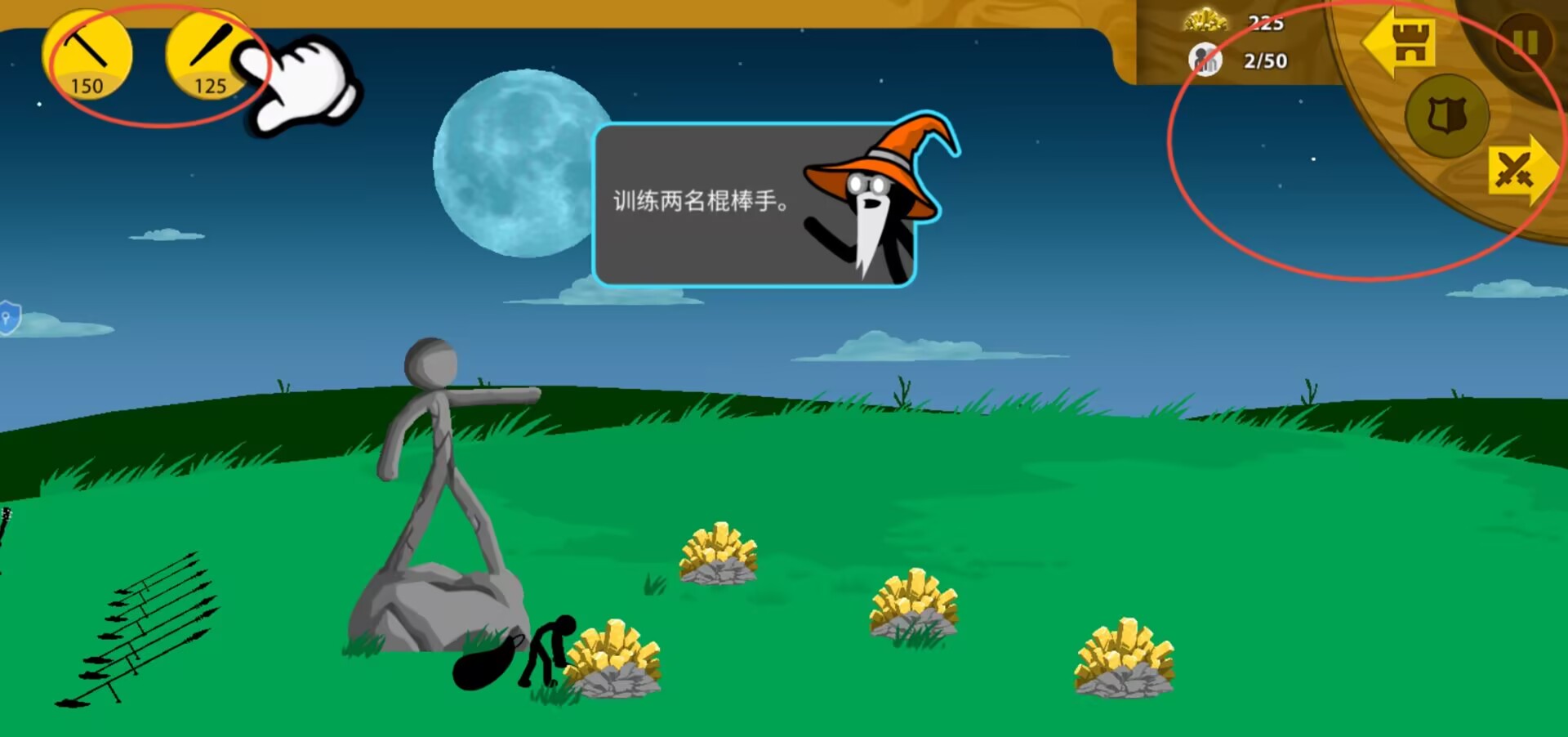 3、界面左侧设有矿工招募和武器调用的按钮,标示了所需黄金数量,右上角展示当前的资金余额,战斗指令则通过双剑图标来启动。