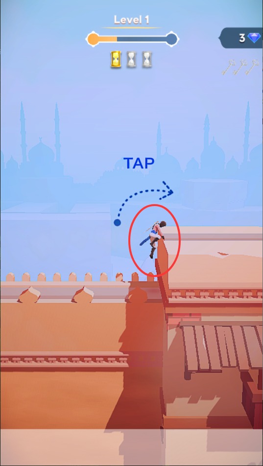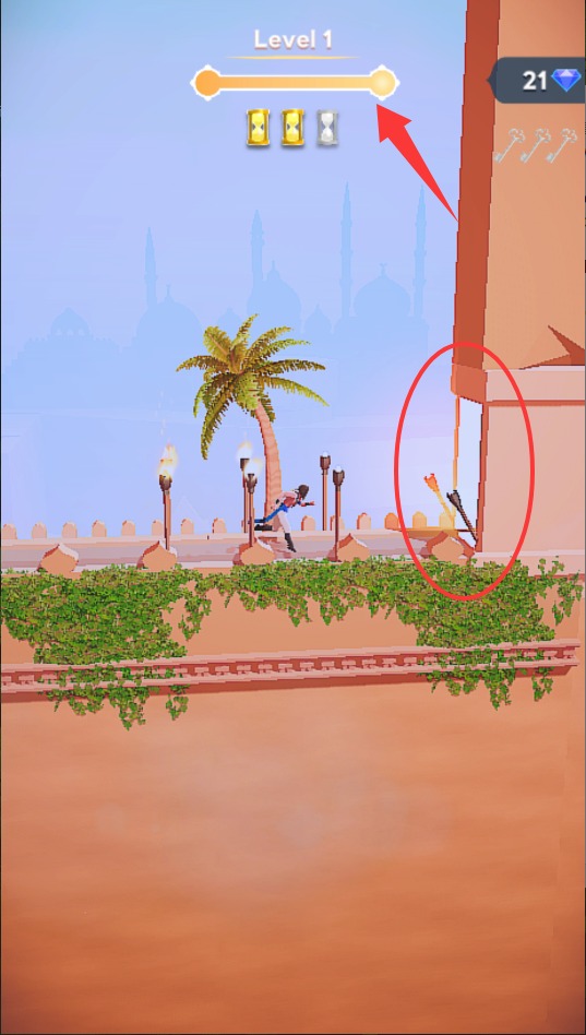 1、游戏开始时,先点击跳跃键控制角色跳过障碍物,要注意掌握好起跳的时间以防止踩空掉落。如果操作失误从平台上掉落,应立即使用背包中的绳索道具把自己拉回到安全地带。