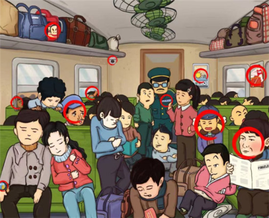 这一关的场景是上世纪八九十年代的老式火车车厢,所有需要找到所有不符合年代的东西。