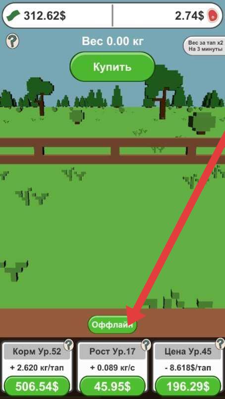 2、猪只卖出后,点击【Оффлайн】(离线)按钮,可领取离线收益,积累资金用于下次养殖。