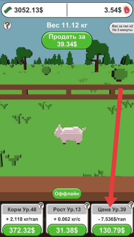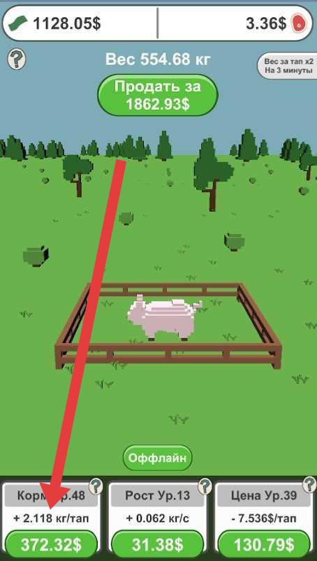 1在养殖界面,点击【Корм】(饲料)升级按钮,消耗372.32$以提升饲料等级,从而提高猪的体重增长速度。