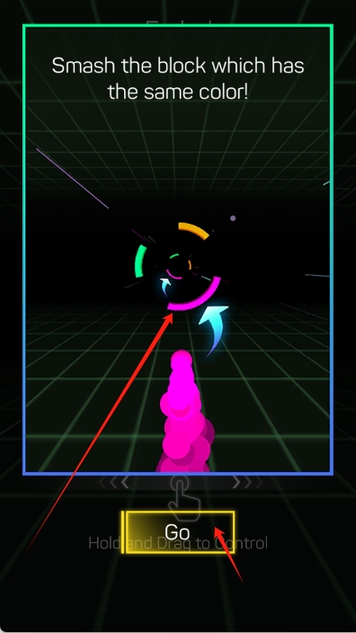 1、操控单色小球自由落下,观察其粉碎成碎片的基础效果,熟悉游戏的物理碰撞机制与操作方式。