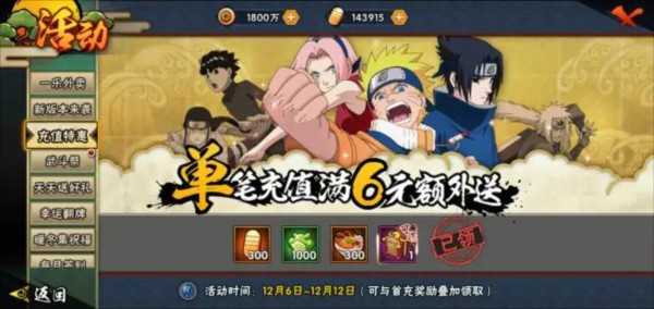 16、特定时间会有充值特惠活动,例如单笔6元充值可获300金币+1000声望+300体力+b忍碎片*5任选其一。一般情况下,25元特惠不太划算,但50元充值活动值得考虑,奖励包括500忍玉+500力+50秘术之星+2片S忍选其一。