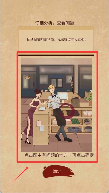 2、开始游戏后需要我们仔细分析查看问题,点击图中有问题的地方,再点击确定。