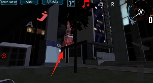2、开车时,按照【箭头】指向的东京塔方向,在城市道路上行驶,并注意避开建筑物。