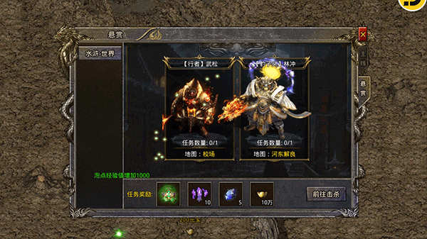 悬赏任务要求玩家挑战游戏中的副本boss。游戏里有两位副本boss,即行者武松与豹子头林冲。成功击败他们,会获得不同的掉落物品。要是玩家想要神兵和特戒,就去刷武松;若需要灵根和圣火,那就刷林冲。此外,刷这两个boss都能够得到剑甲。