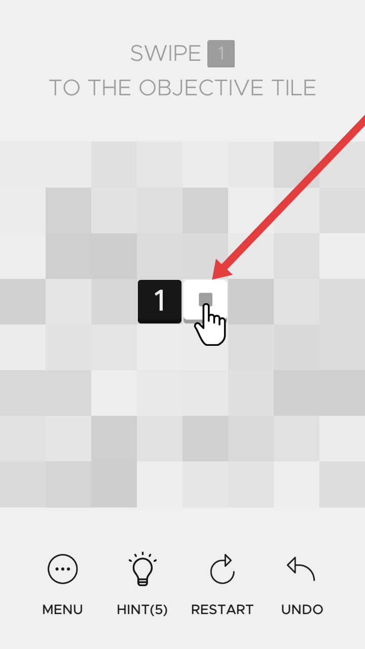 2、教程界面提示【SWIPE1TO THE OBJECTIVE TILE】,演示滑动标“1”的方块到目标格,底部有菜单、提示等功能键。