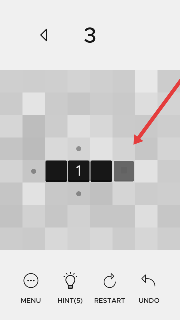 3、关卡3界面,顶部显示「3」,中间是方块布局,底部设【MENU】【HINT(5)】【RESTART】【UNDO】按钮,辅助关卡挑战。