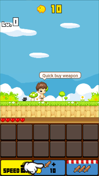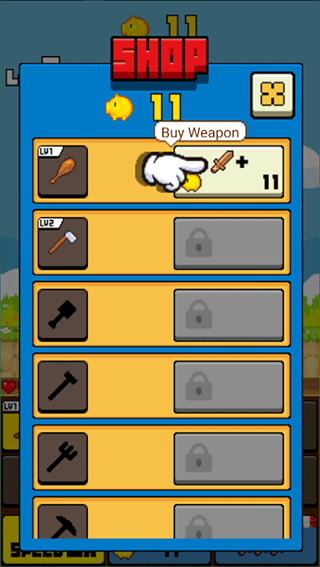 6、人物会自行走动并攻击小怪,你仅需购买武器进行升级,或者跳到上层去攻打更高级别的怪物。