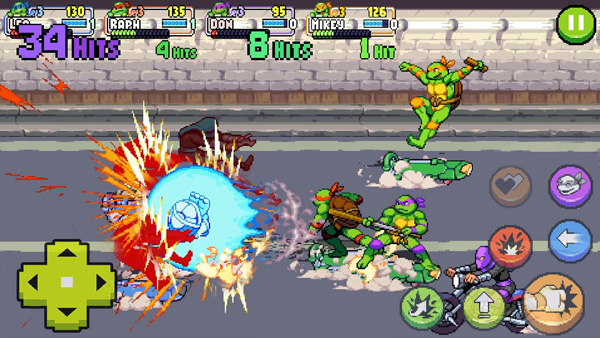 - 携手《忍者神龟》的经典角色共同闯关,其中有忍者神龟英雄莱奥、拉夫、唐尼以及麦奇。除此之外,还能够挑选新加入游戏的角色爱普、斯普林特师父或者凯西·琼斯!