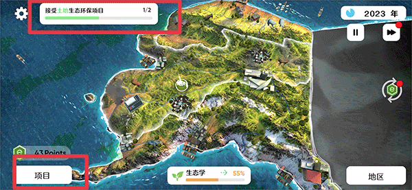 4、屏幕的左上角会显示目标任务,按照要求完成目标任务,例如接受土地生态环保项目,点击右下角项目