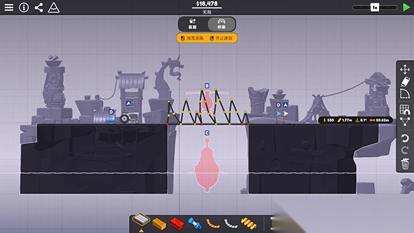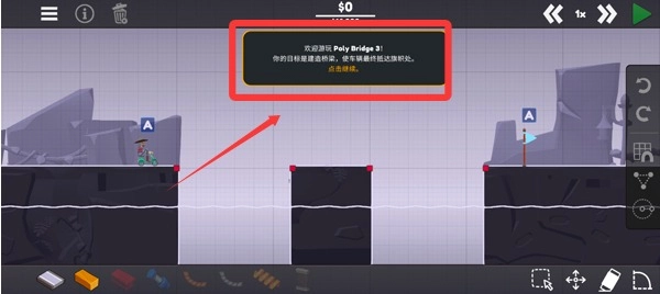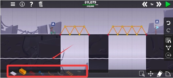 3、当完成新手教程,便能正式开启游戏。此时,我们要运用左下方的材料来搭建桥梁。