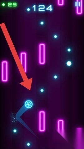 1、控制雪花形状的角色,在紫色霓虹灯场景中避开粉色竖条障碍物,收集蓝色光点,累积分数和左上角的能量。
