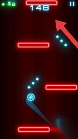 2、切换红色霓虹场景,雪花角色躲避红色横条及斜向障碍,持续收集光点,提升分数至148。