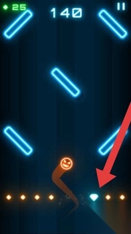 3、能够解锁南瓜头角色,在蓝色霓虹环境中避开旋转的蓝色斜条障碍物,收集底部的钻石,保持分数达到140分。