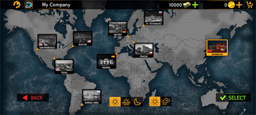 3、挑选你心仪前往的地区,游戏里包含各类现实中的城内与城外地图,像美国(旧金山与德克萨斯)、南美洲(布宜诺斯艾利斯)、欧洲(德国、西班牙、布拉格、圣彼得堡)、迪拜、上海等。此外,还能在下方选择当前地区一天内的多个时段以及天气状况,点击“SELECT”就能完成操作。
