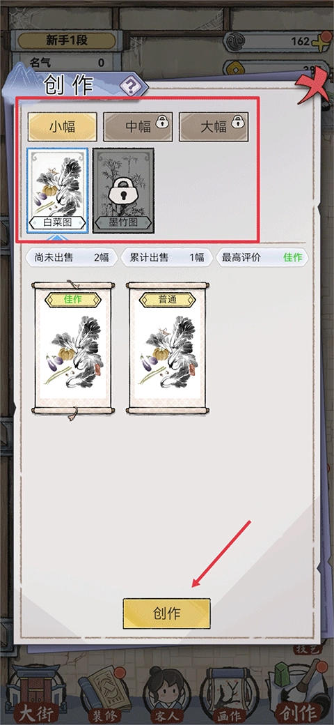 1、双击打开水墨记游戏,你将需要经营一家画室,而经营画室首先需要创作画作,点击右下角创作画作;