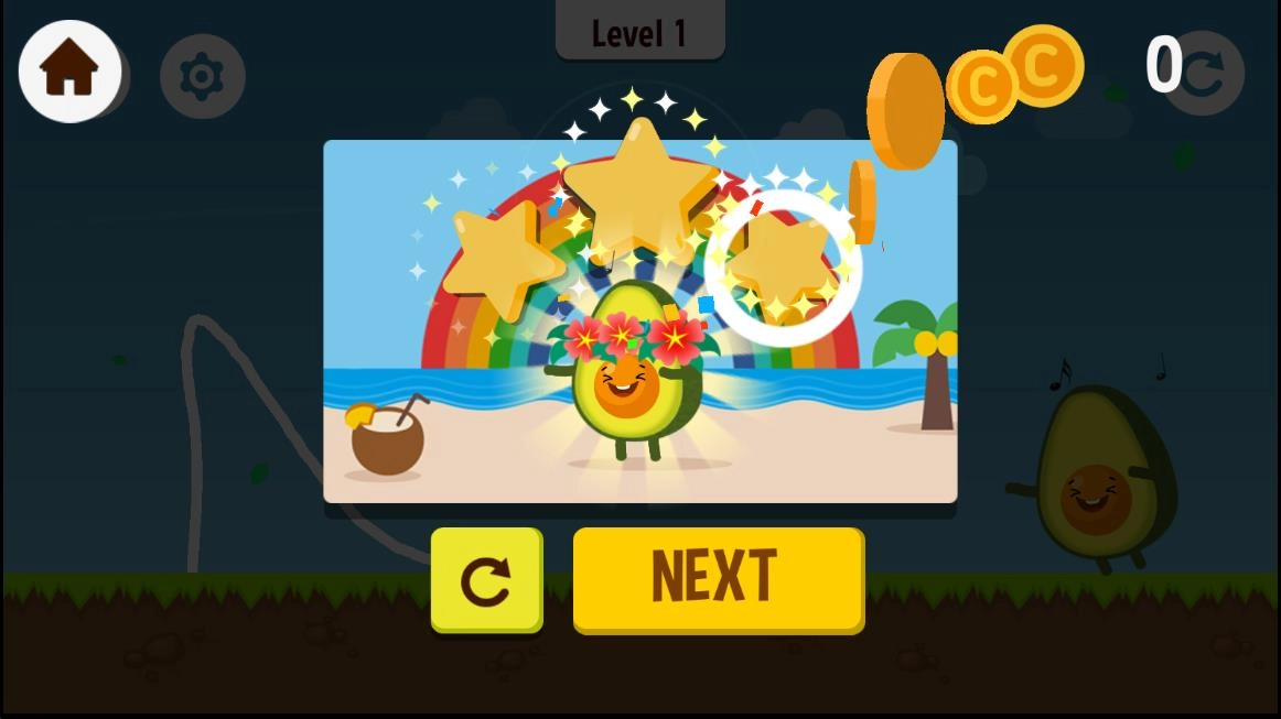3、点击开始按钮让鳄梨沿绘制的道路滑动,若成功到达目标点则通关,解锁新关卡与更复杂的场景布局。
