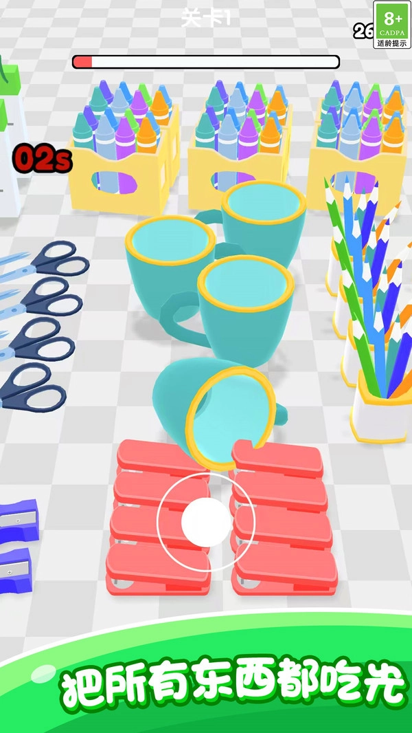 4、各个相关的物品将以不同的布局出现在场景中,你需要尽快观察它们的位置,找到合理的吞噬方案。