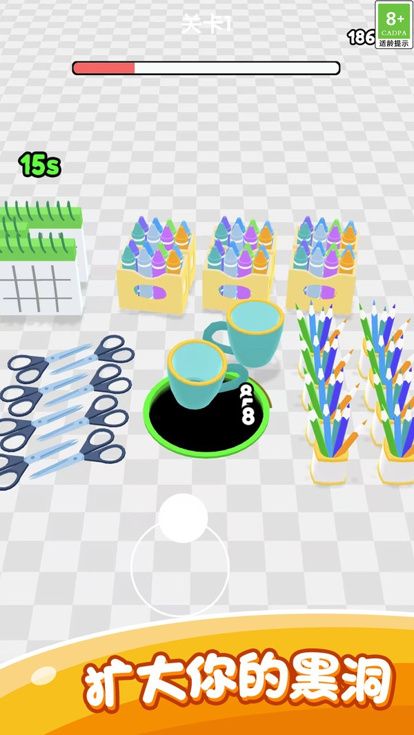 2、随着黑洞面积的逐渐扩大,它可以更快地吸收更多的物品,从而提升速度,收集界面上所有种类的商品。