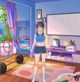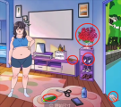 首先,让女孩借助呼啦圈先瘦下一些。接着,打开门能看到健身房的卡片,然后拉着女孩出去跑步。