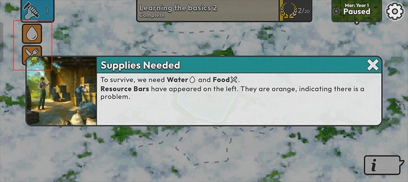 3、生存离不开水源与食物,屏幕左侧设有资源状态栏,当资源短缺时,该状态栏会变为橙色,此时需尽快补充资源。