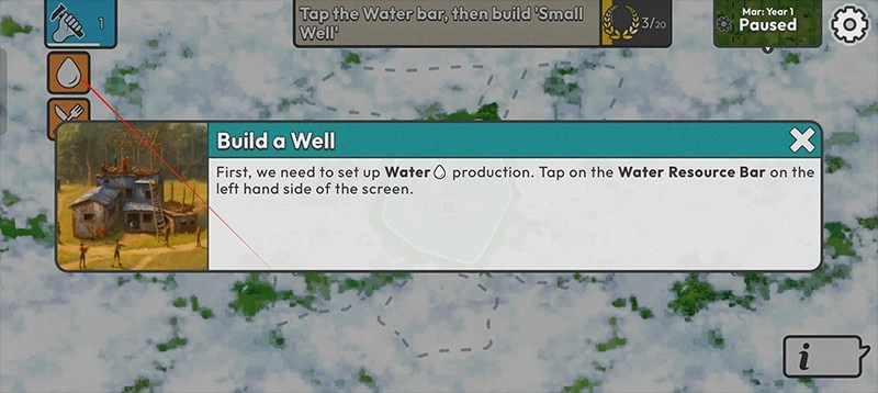 4、第一步,建造一口水井,操作时点击左侧的水资源栏。