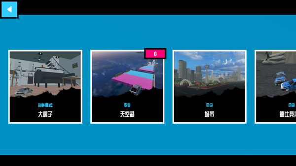 赛道、滑梯、撞墙、汽车蹦床、机器压力机、跑酷区、天空遮挡区、漂移车模拟器;