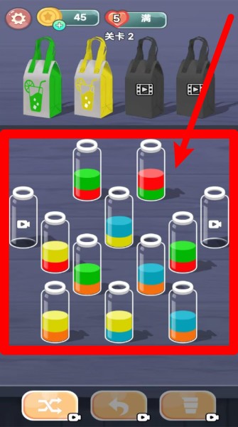 1.在初期关卡中,玩家需要将颜色一致的液体倒入同一个试管内,通过不断尝试来完成排序目标。