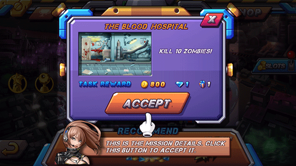 1. 握紧你的武器,为了生存奋勇作战。在完成击杀僵尸以及成功存活的任务过程中,你能够赚取金币与钻石。