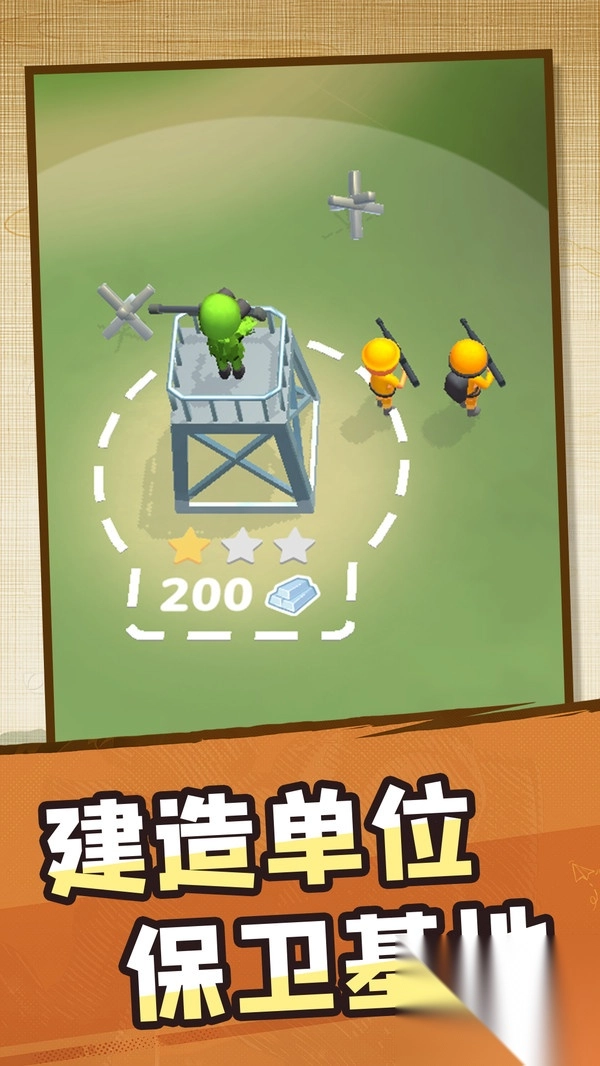 2、通过简单的点击和拖动操作,玩家可以指挥小兵收集战场资源,建造防御工事和瞭望塔;