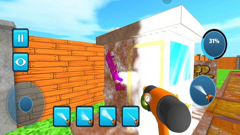 1、玩家通过触摸屏幕拖动来控制喷嘴的瞄准角度,并调整水压强度,以对目标区域进行彻底清洗。