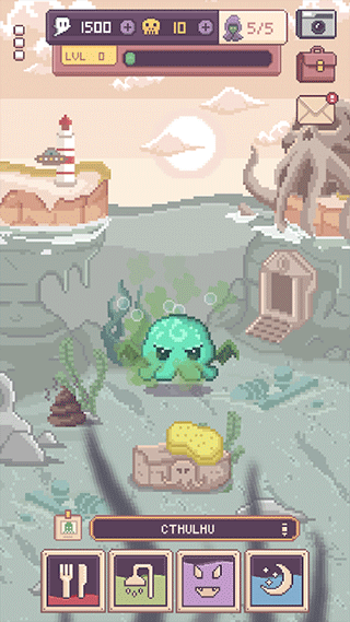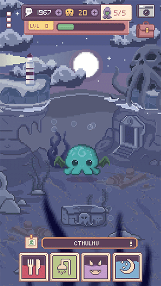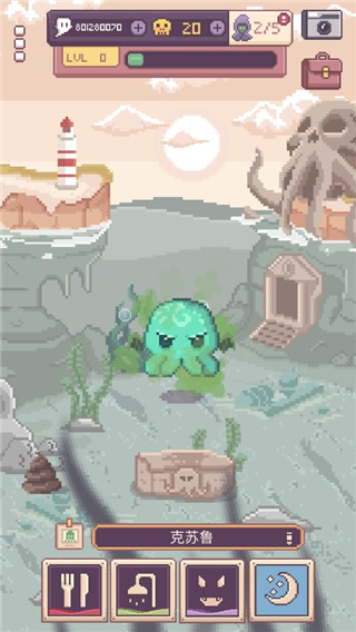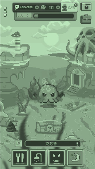 克苏鲁宠物2采用像素画风,简单的场景,标准的独立小游戏的风格,游戏美术比较简单也比较Q萌。