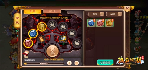 闯荡江湖,从初出茅庐的新手成长为普通侠客并非难事,但要从普通侠客进阶成为大师级高手,那可绝非易事。后期每提升一步都艰难无比。为助力强者更上一层楼,91级及以上的玩家均可进入秘祝系统收集密文。密文收集仅仅是提升实力的第一步,只有把密文放置到符印当中,才能激活相应的属性与效果。每天有一次免费祈言机会,免费次数用完后,还能使用召言符和悟道宝卷继续进行祈言。