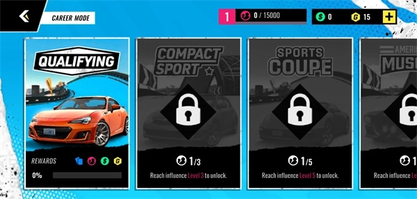 2、在游戏开始前我们可以到车库解锁自己喜欢的赛车,赛车可分别为C、B、A、S等级。