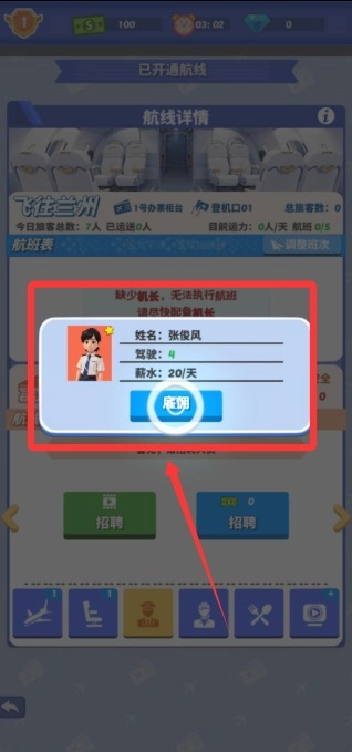 3、经过一轮筛选,最终确定了有4年驾驶经验的张俊风。点击“雇佣”,即可开通航线。