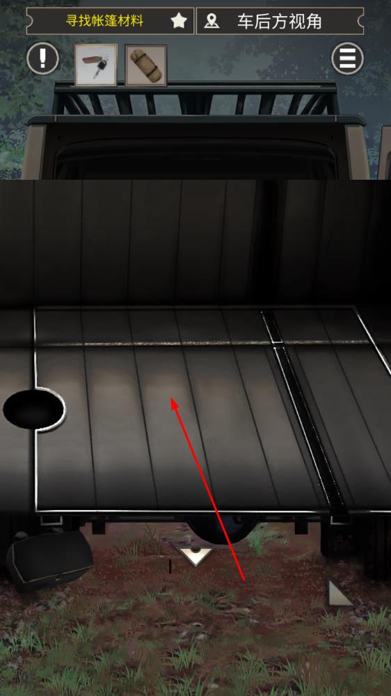 1、开始游戏后,从正面场景的白色箱子上拿到车钥匙,然后使用车钥匙打开汽车后备箱,从中取得钉子、支柱和帐篷布,将这些物品组合起来搭建帐篷,从而迈出解谜的第一步。