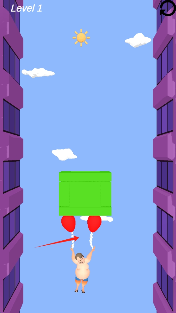 2、在游戏中,控制角色抓住气球,通过操作让其上升,穿过城市建筑之间的通道,并点击打破绿色方块。