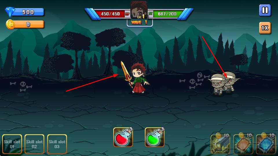 2、在战斗场景,操控角色移动,点击攻击方向,对怪物发起进攻,利用技能槽策略释放技能。