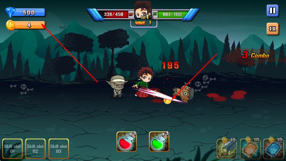 3、战斗中拾取怪物掉落金币,留意血量变化,适时使用红绿药水恢复,争取存活并推进波次。
