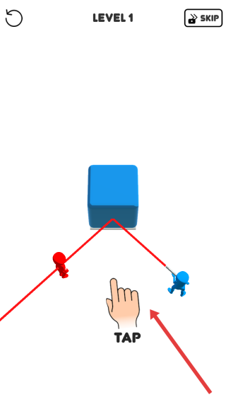 1进入LEVEL-1界面,点击TAP位置,使红蓝小人通过红线相互配合,共同推动蓝色方块以完成关卡。