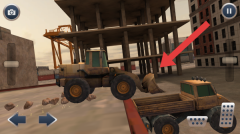 3、展示建筑施工场景,包括未完工的建筑和起重机等元素。界面中包含方向控制按钮、操作键、相机视角切换以及暂停图标,用以体现车辆之间的协同作业。